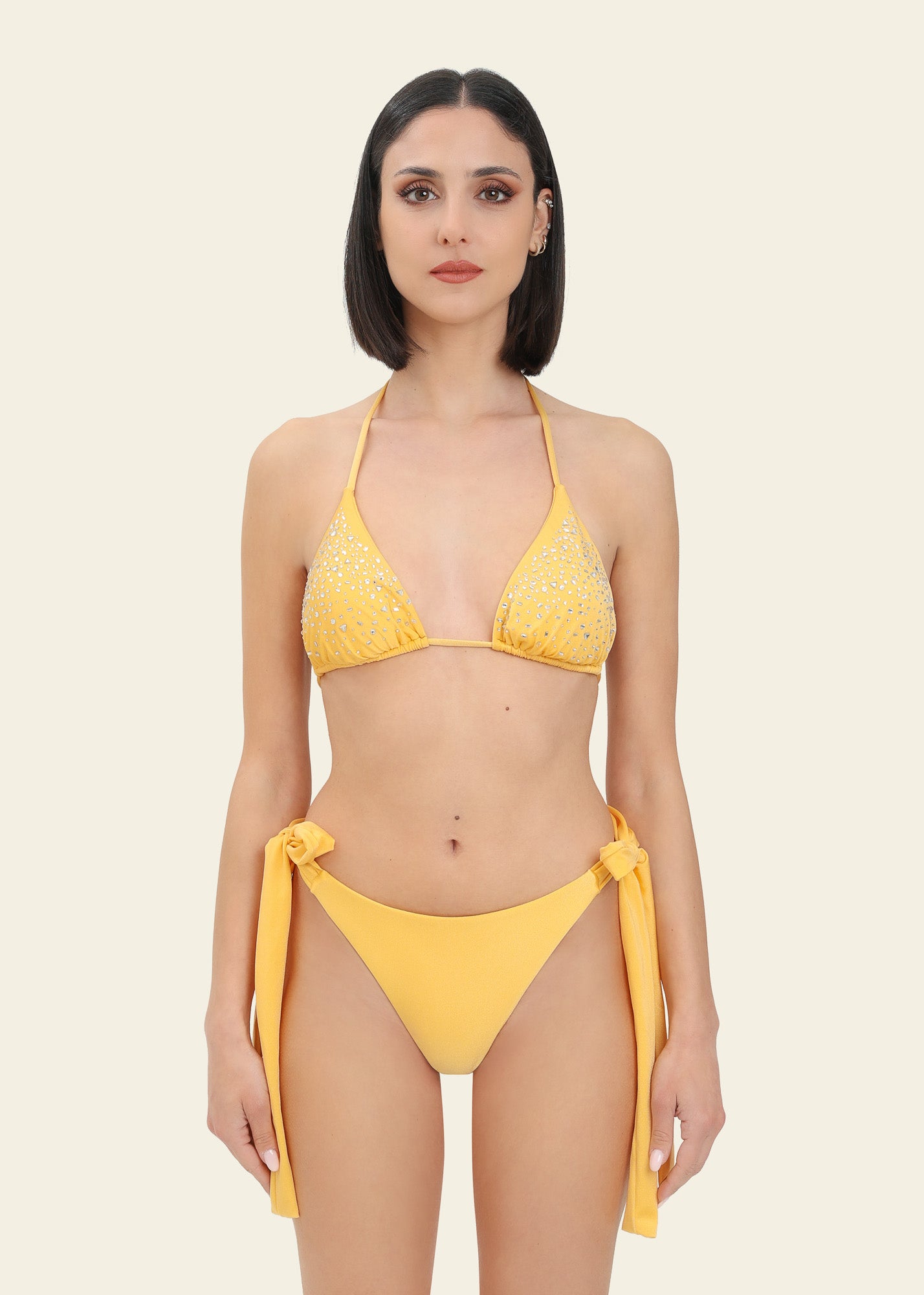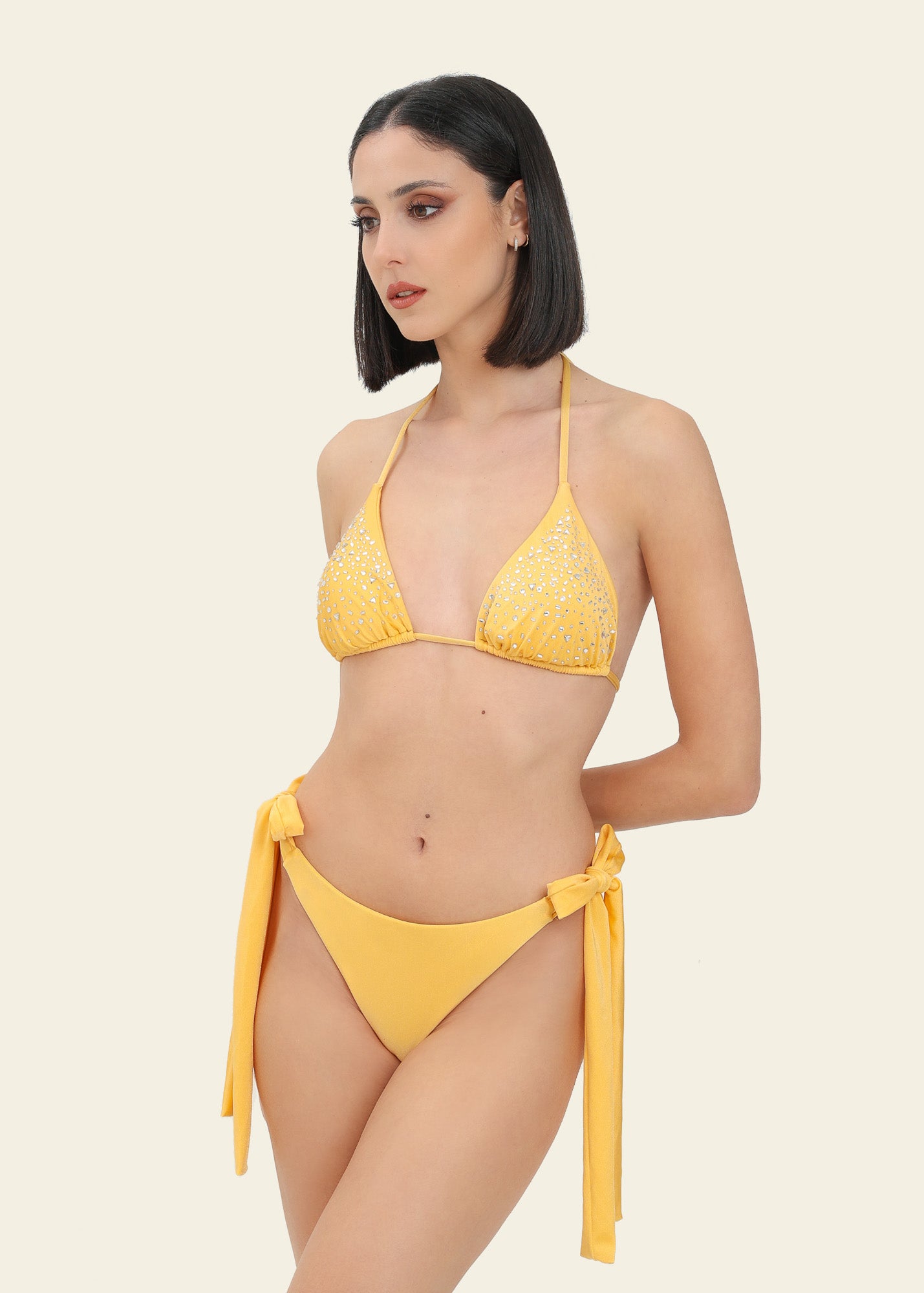 Realizzato in morbido e brillante tessuto Giallo il bikini Juliet si adatterà ad ogni silhouette grazie al design a triangolo, un classico intramontabile rivisitato in chiave moderna e raffinata.