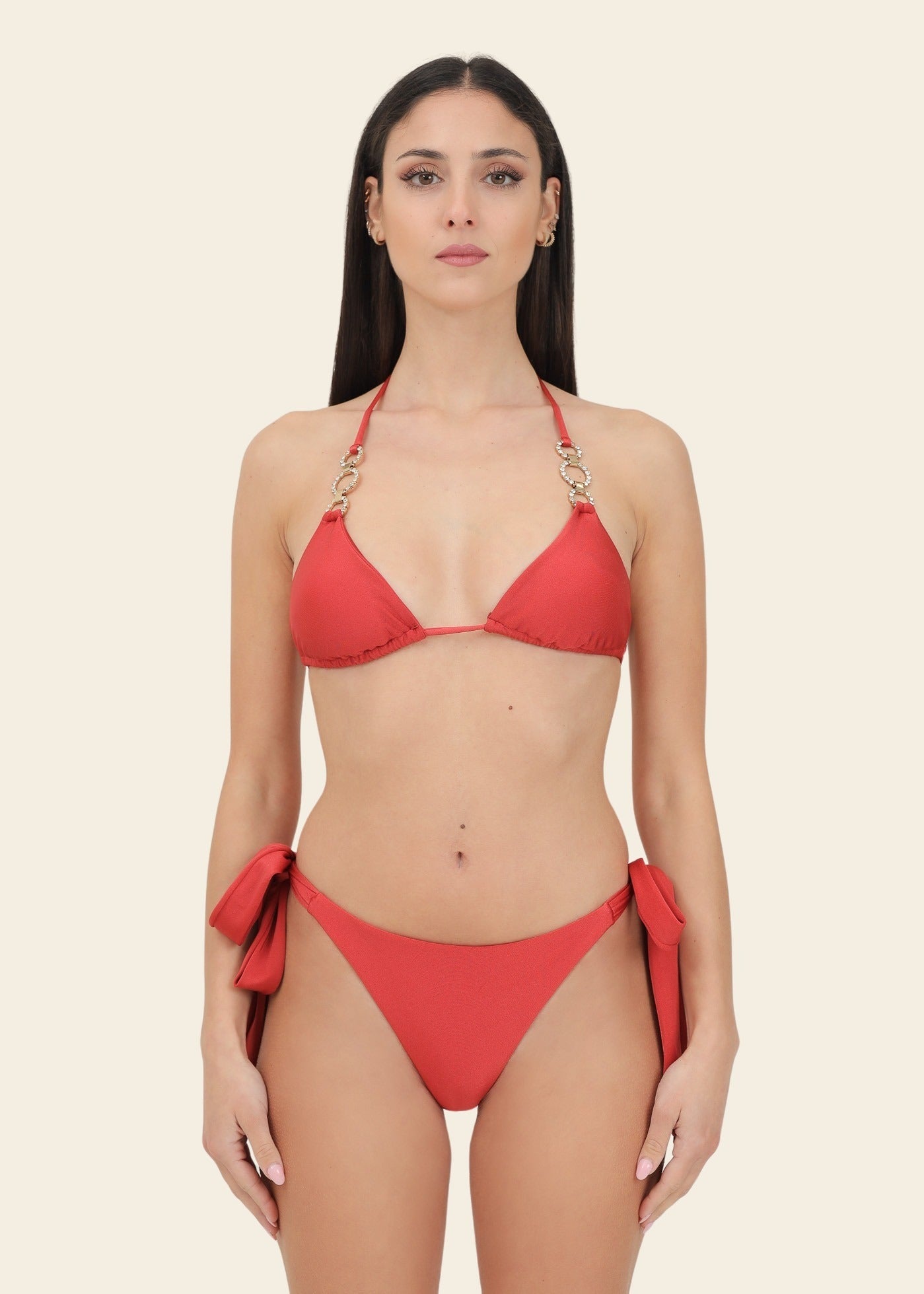Minimale ma elegante, grazie ai meravigliosi accessori tempestati di cristalli che profilano la spallina, il bikini si adatterà ad ogni silhouette valorizzandola.