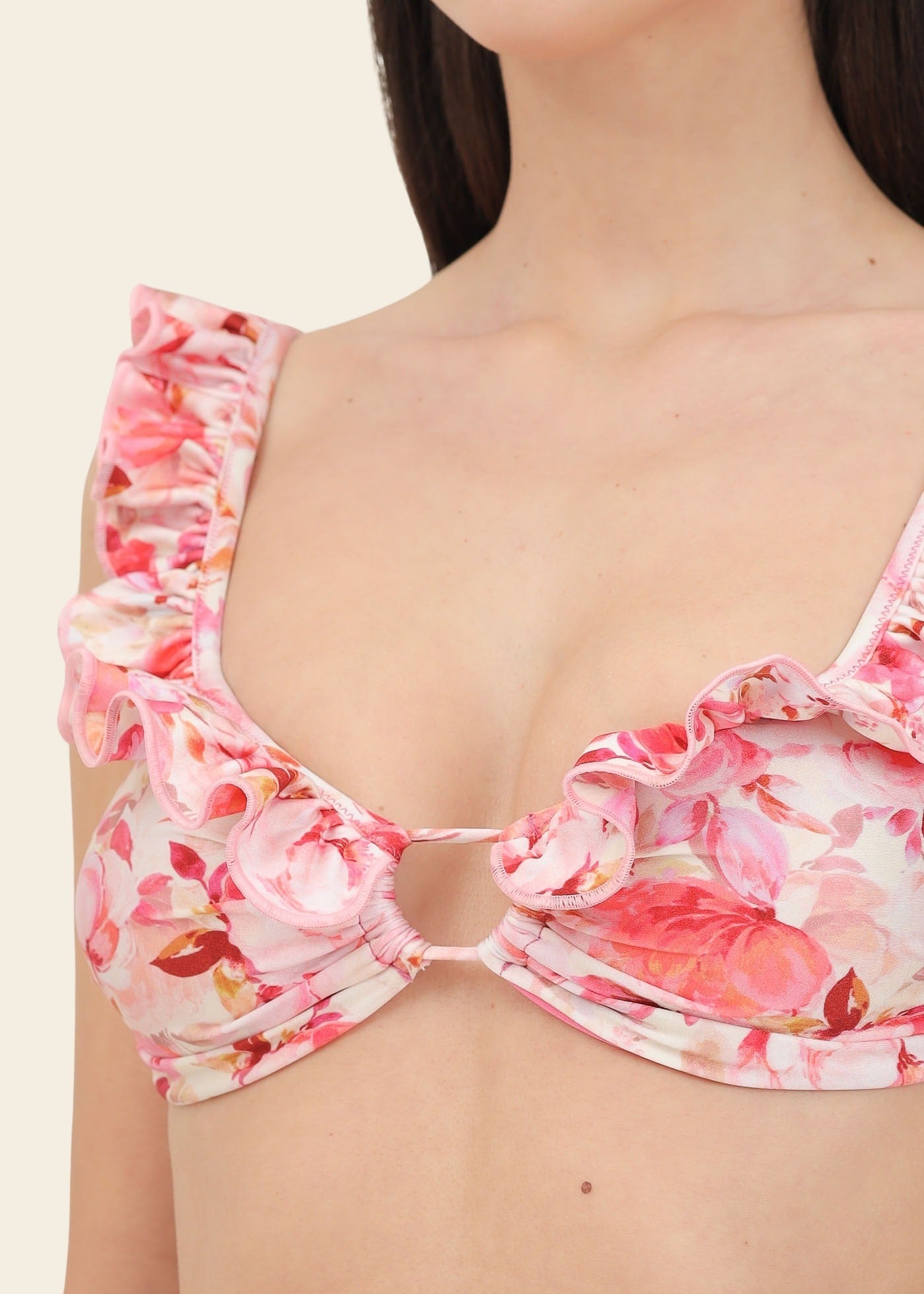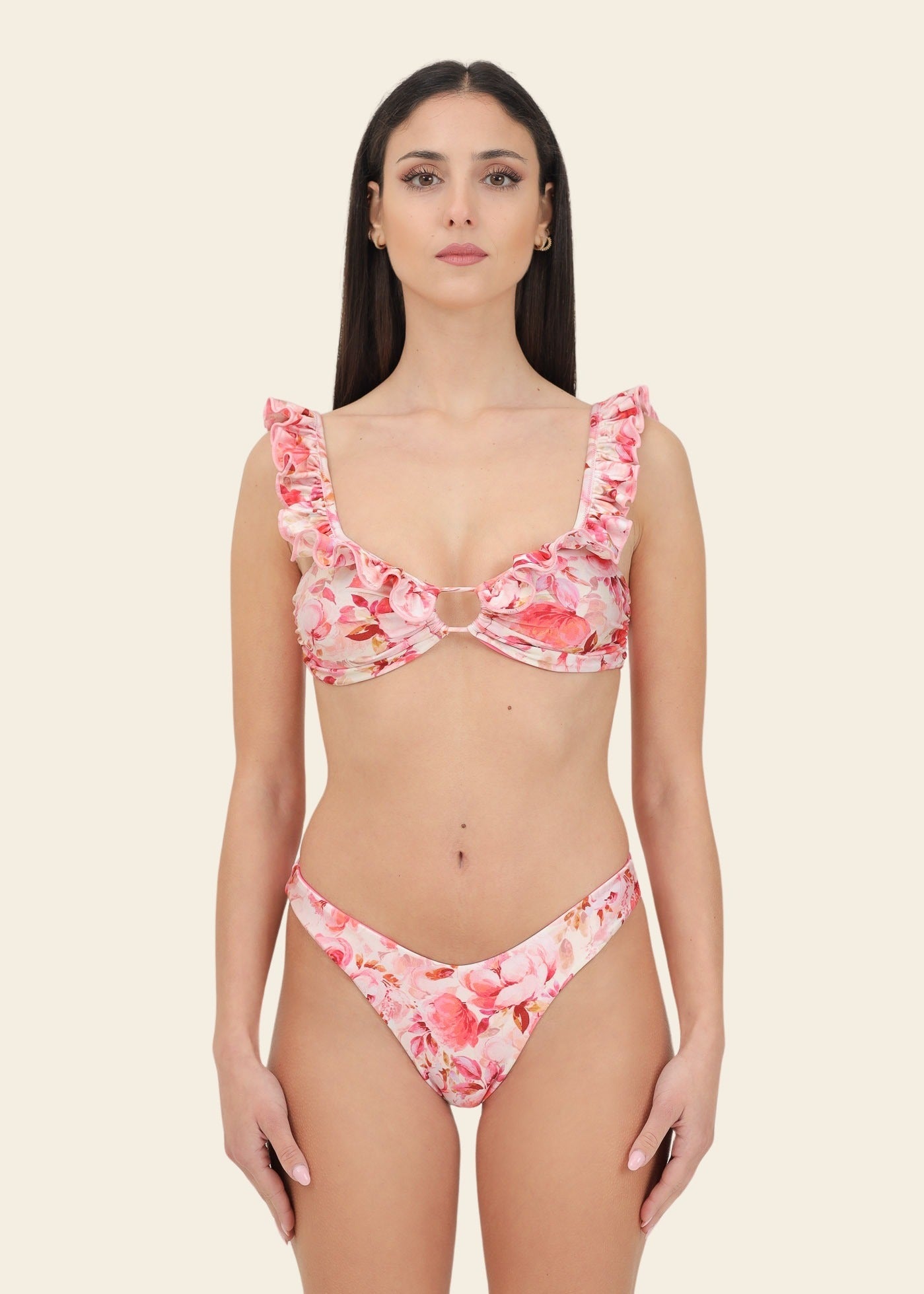 Il top è realizzato in morbido tessuto lycra brillante con fantasia Rose esclusiva by Rélevé ed è supportato da coppe estraibili che valorizzeranno ancor di più il décolleté arricchito da voluminose ruches che profilano le spalline e lo slip a vita alta dalla generosa sgambatura